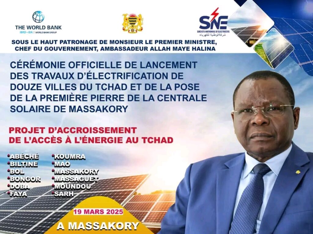 Non classé ANNONCE | Le Tchad va lancer le 19 mars 2025 à Massakory de grands travaux dans le cadre de l’électrification du pays. La Rédaction 17 mars 2025 Continue Reading Previous: Moundou | lancement de la Phase 2 du Projet de Lutte contre les InondationsNext: Tchad | M. Nassouradine Abakar Kessou, Directeur de l’Office National pour la Promotion de l’Emploi (ONAPE), a lancé une formation destinée aux conseillers emploi de N’Djamena. Laisser un commentaire Annuler la réponseVotre adresse e-mail ne sera pas publiée. Les champs obligatoires sont indiqués avec *Commentaire * Nom * E-mail * Site web Enregistrer mon nom, mon e-mail et mon site dans le navigateur pour mon prochain commentaire. Histoires connexes Non classé Portrait | Colonel Abderamane Oki Youssouf, itinéraire d’un officier d’excellence et d’exception. La Rédaction 5 décembre 2025 Non classé Tchad | la Coalition pour les réformes Electorales au Tchad (CRET) a officiellement lancé, ce 03 décembre 2025 ses activités de plaidoyer citoyen en faveur de réformes électorales. La Rédaction 3 décembre 2025 Non classé Tchad | À l’occasion de l’édition 2025 de la Journée internationale des personnes handicapées, le Tchad s’est joint à la communauté mondiale pour réaffirmer son engagement en faveur de l’inclusion et de l’égalité des chances. La Rédaction 3 décembre 2025